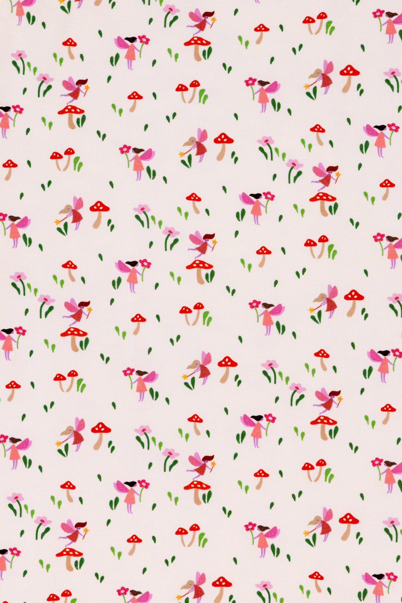 A soft cream base scattered with playful woodland mushrooms in warm. cheerful tones.