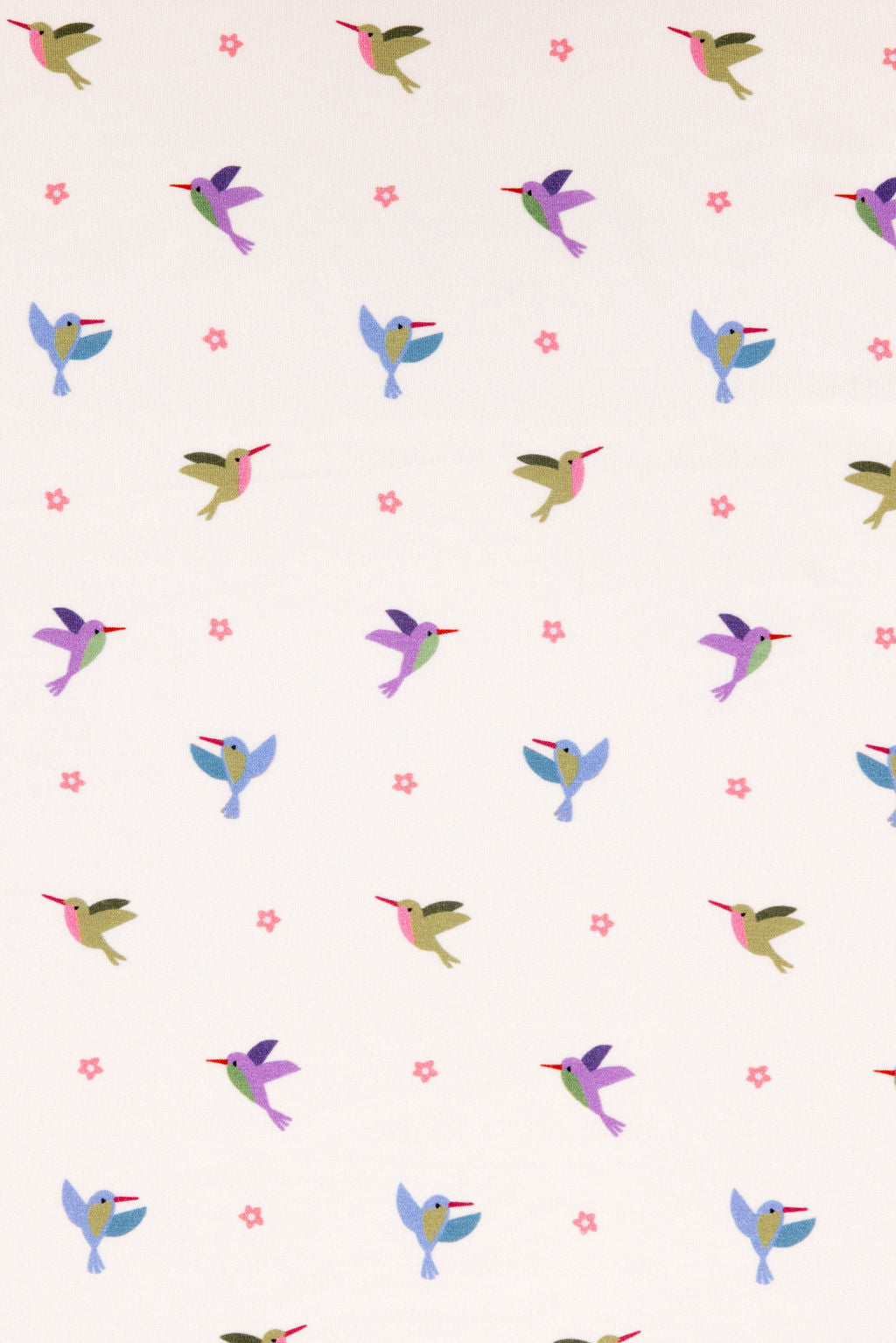 Creamy base with playful hummingbirds in shades of coral. teal. and lavender.